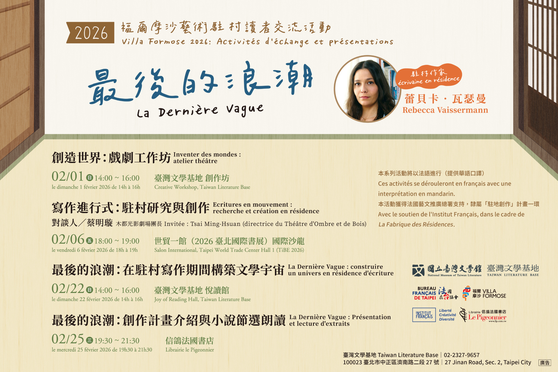 本年度駐村得主為法國作家暨演員 蕾貝卡.瓦瑟曼(Rebecca Vaissermann),其創作聚焦於記憶與傳承、剝削與反抗等主題,並將於駐村期間創作以臺灣為背景之小說《最後的浪潮(La Dernière Vague)》。活動內容涵蓋戲劇工作坊、創作對談、文學宇宙建構分享及小說朗讀,誠摯邀請對文學、戲劇與跨文化創作有興趣之師生與民眾踴躍參與。